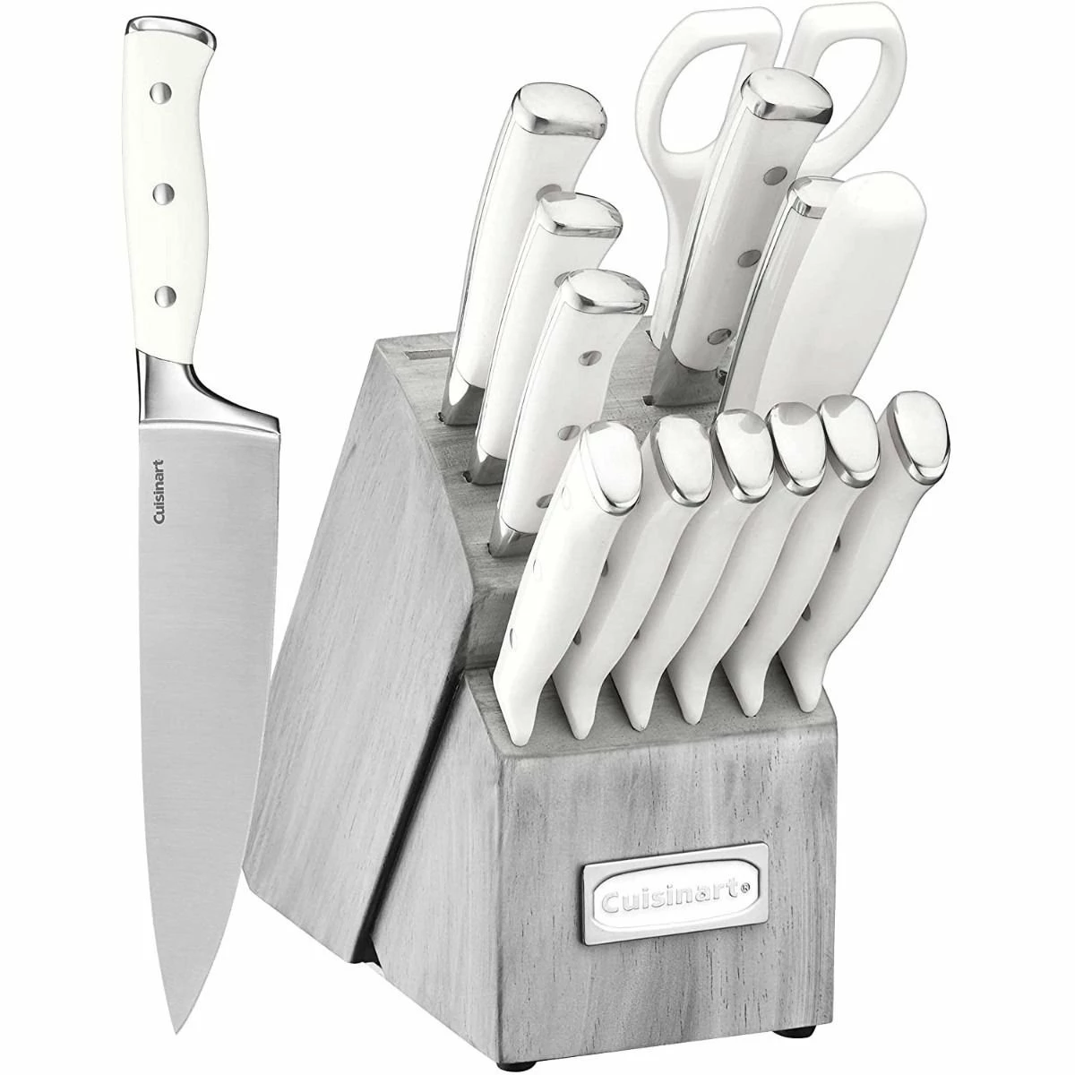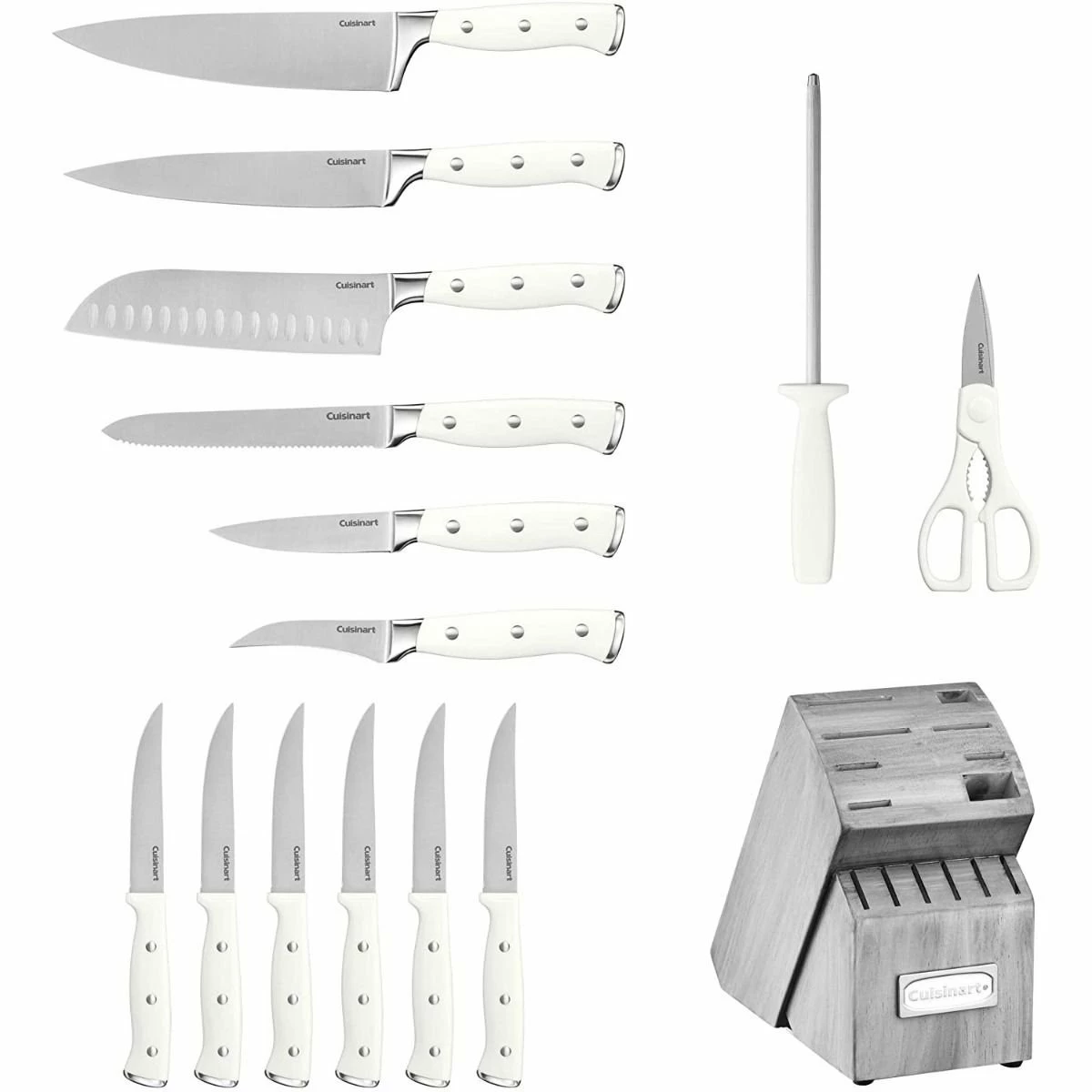 When it comes to exceptional performance and affordability, consider the Cuisinart 15-piece Triple Rivet Cutlery Block Set as your choice knife set for all your meal preparation! Each forged blade is made from high-carbon stainless steel that tapers into a slender, ultra-sharp edge for precision and accuracy. The blades are break-resistant, chip-resistant, and rust-resistant. Complete with triple-riveted full-tang construction with wide bolsters for safety, these blades are complete with white ABS-composite handles that are ergonomic, providing balance and comfort in the grip of your hand. This 15-Piece Knife Set includes an 8″ Chef’s Knife, 8″ Slicing Knife, 7″ Santoku Knife, 5.5″ Serrated Utility Knife, 3.5″ Paring Knife, 2.75″ Bird’s Beak Paring Knife, six 4.5″ Steak Knives, 8″ Sharpening Steel, All-Purpose Household Shears, and the grey wooden knife block. This whole set allows you to do essential food prep from slicing/dicing/chopping meats and veggies to more detailed work with stripping and mincing herbs. When you are done using any of the knives in this set, Cuisinart recommends you hand wash them for the utmost maintenance. Don’t be without a quality knife set that doesn’t cost a fortune—order the Cuisinart 15-piece Triple Rivet Cutlery Block Set today!