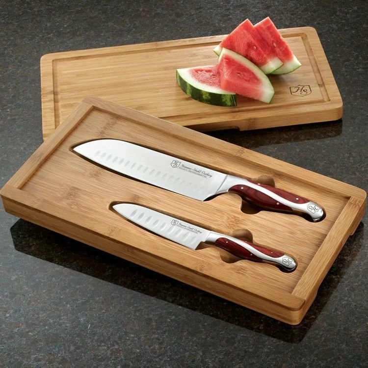 Included with the two blades is a bamboo case for easy storage. The beautiful bamboo case is easy to tuck away, or displays nicely on countertops. For optimum organization, the knife case doubles as a cutting board. The wooden material provides a soft cutting that won’t harm the blade of the knife, which improves the lifespan and edge retention. The built-in juice well prevents extra liquids and juices from spilling into other produce or countertops, making cleanup quick and easy. With the ability to conquer all of your daily meals, the Hammer Stahl Classic Collection 2 Piece Santoku Knife Set & Bamboo Cutting Board Case is an ideal starter piece.