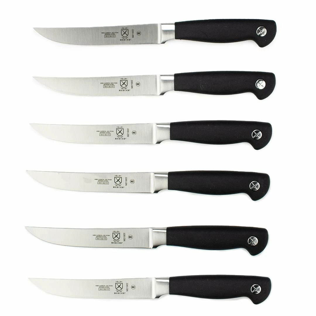 Enjoy delicious meals with ease using the Mercer Genesis Plain Edge Steak Knife Set. This set of six knives is an Everything Kitchens exclusive. Each blade is forged from high carbon German steel and NSF certified, so they are at home in both professional and home kitchens. The Genesis steak knives feature an ergonomic handle, black with silver accents that are as comfortable to use as they are beautiful to look at. Designed with a straight-edged blade, these knives are perfect for cutting tough meat and thick vegetables. This versatility makes the Everything Kitchens exclusive Genesis Steak Knife Set a must-have for your cutlery collection.