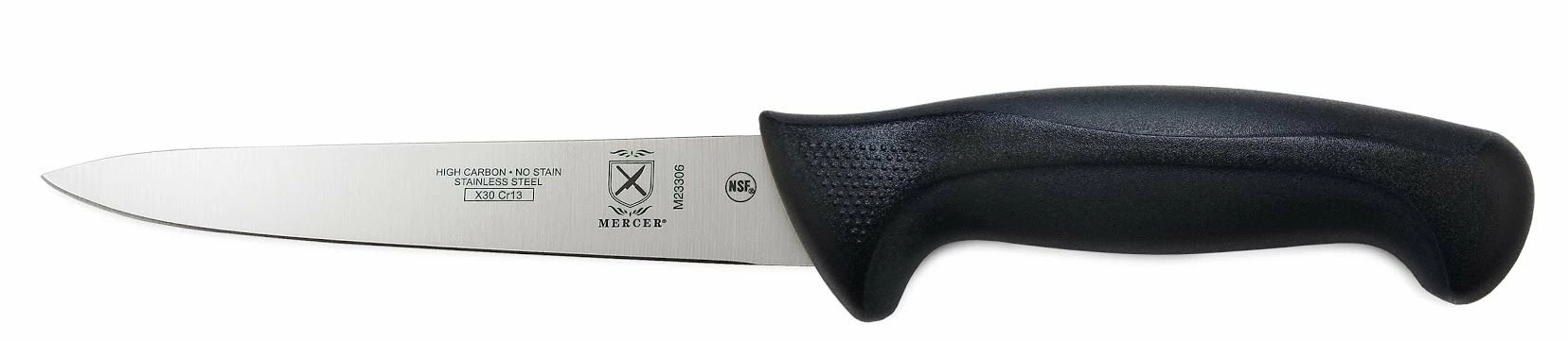 Prepare tricky produce and large cuts of meat with Mercer’s Millennia™ 6″ Commercial Utility Knife. The ergonomic handle is designed with Santoprene for comfort and polypropylene for durability. Millenia blades are designed with one piece of high carbon stainless steel, razor-sharp edges, and textured fingers for an innovative design to meet the demands of today’s professional chefs. Mercer’s Millenia™ 6″ Commercial Utility Knife has a straight blade ideal for slicing straight down to the cutting board!