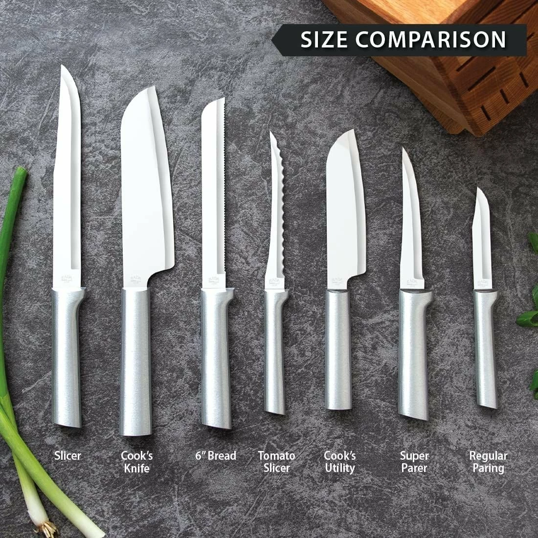Accomplish all your slicing and dicing needs with the Cook’s Knife from Rada Cutlery. With a blade constructed from surgical quality high carbon stainless steel and sleek silver satin handles, this knife is as aesthetically pleasing as it is practical. This professional design features a slightly curved blade that allows for more control when dicing and mincing. The hand-sharpened, hollow ground blade is designed to maintain a razor sharp edge for easily cutting through even the toughest foods, and the offset handle keeps your fingers safe while chopping. For a kitchen knife that blends quality with affordability, order your Rada Cutlery Cook’s Knife today!