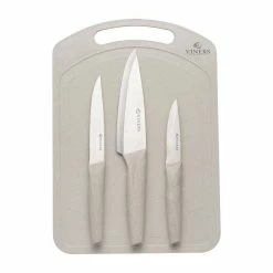 The set includes a 6” chef’s knife, which can tackle almost any kitchen task in a pinch, a 5” Utility knife that is great for prepping small ingredients, and a 3.5” utility knife, great for peeling fruits and vegetables. With this small but powerful set of knives, you can feel great about doing your part for the environment and enjoy versatile knives that get things done! Add a little green to your kitchen, get the Viners Organic 3-Piece Knife Set and Board today!