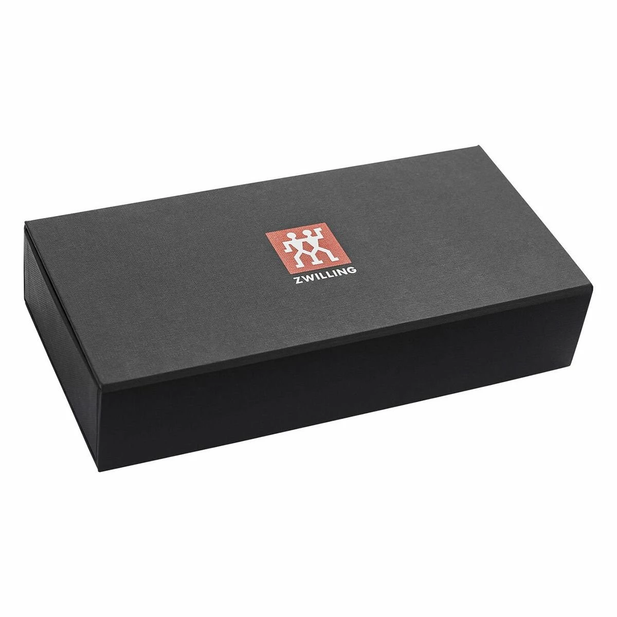 Bring a stroke of refined elegance to the table with the Zwilling J.A. Henckels Porterhouse Stainless Steel 8-Piece Steak Knife Set! Designed in Italy and engineered in Germany, each knife is precision-forged from a solid piece of stainless steel to provide strength and durability. The 4.5″ blades are then sharpened to provide razor-sharp cutting edges that will effortlessly slice through even thick cuts of meat. Each stainless steel handle is ergonomically shaped to provide a comfortable grip and is polished to a matte finish for a contemporary look. The 8-piece set comes in a black wooden box featuring the distinctive Zwilling logo and is perfect for gift presentations or everyday storage.